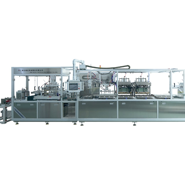 ฟิล์มพุพอง (PVC/PET หรือวัสดุเทอร์โมฟอร์มได้อื่นๆ) ลำเลียงตัวส่งต่อไปยังสถานีขึ้นรูปหลังจากถูกให้ความร้อน หลังจากเกิดตุ่มพองแล้ว สถานีตัดจะตัดตุ่มพองออกจากเลนฟิล์มด้วยมีดในทิศทางตามยาวและแนวขวางโดยไม่มีเศษวัสดุเหลือใช้ จากนั้นตุ่มจะถูกหยิบขึ้นมาวางในพาเลทปิดผนึกและพร้อมสำหรับ ผู้ปฏิบัติงานโหลดผลิตภัณฑ์ลงในแผลพุพอง สามารถติดตั้งระบบให้อาหารอัตโนมัติได้ การ์ดด้านหลังจะถูกวางไว้บนแผลพุพอง หมุดระบุตำแหน่งบนพาเลทจะทำให้การ์ดอยู่ในตำแหน่งที่ถูกต้อง ในสถานีปิดผนึก ตุ่มและการ์ด จะถูกปิดผนึกโดยวิธีการทำความร้อน วิธีการปิดผนึกขึ้นหรือลงสามารถเลือกได้ ขึ้นอยู่กับข้อกำหนดของวัสดุบรรจุภัณฑ์ ในที่สุด ตุ่มจะถูกหยิบขึ้นมาและวางบนสายพานลำเลียงขาออก